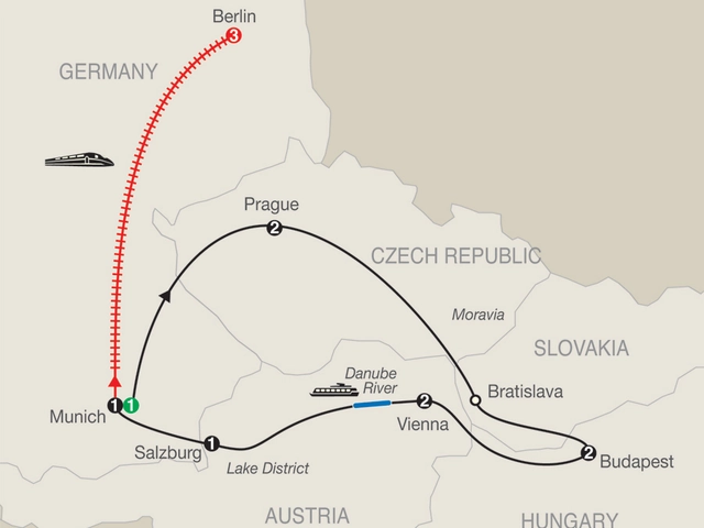 MUNICH Welcome dinner; orientation including Marienplatz; farewell dinnerPRAGUE Guided sightseeing, Astronomical Clock, visit the Hradcany Castle groundsBRATISLAVA [LF] Visit the capital of Slovakia and enjoy a special lunch at a local restaurantBUDAPEST Guided sightseeing, a panoramic view from Fishermen’s Bastion, visit Matthias Coronation ChurchVIENNA Guided sightseeing, visit St. Stephen’s CathedralDANUBE CRUISE [LF] (Departures April 12-October 4) Enjoy Kaffee und Kuchen (coffee and cake) on boardSALZBURG Guided sightseeing, visit Mirabell Gardens and St. Peter’s Churchyard; [LF] taste the traditional Mozartkugel and Doppler Konfekt; a special dinner with wine at a local restaurantMUNICH-BERLIN By high-speed TrainBERLIN Guided sightseeing of historic landmarks. Take pictures of Holocaust Memorial & Brandenburg GateHeadsets throughout the tour