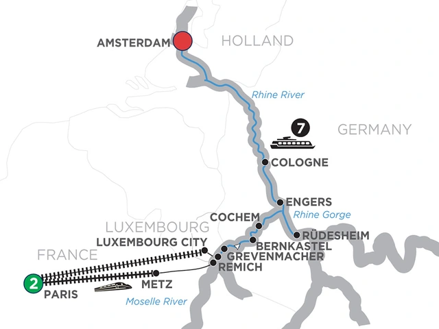Day 1 Paris: welcome to France!Day 2 Paris: guided tourDay 3 Remich (Embarkation)–Grevenmacher: onboard welcome reception; cruise to GrevenmacherDay 4 Grevenmacher. Excursion to Luxembourg City: guided tour in Luxembourg CityDay 5 Bernkastel: choice of guided walk, or hike up to the castle ruins with your Avalon Adventure Host; wine tastingDay 6 Cochem: guided walk, visit Reichsburg CastleDay 7 Rüdesheim–Rhine Gorge: visit Siegfried’s Mechanical Musical Instrument Museum; special treat; cruise through the Rhine GorgeDay 8 Cologne: choice of Cologne highlights walking tour, or Jewish Heritage walking tourDay 9 Amsterdam: canal cruiseDay 10 Amsterdam (Disembarkation): your vacation ends this morning